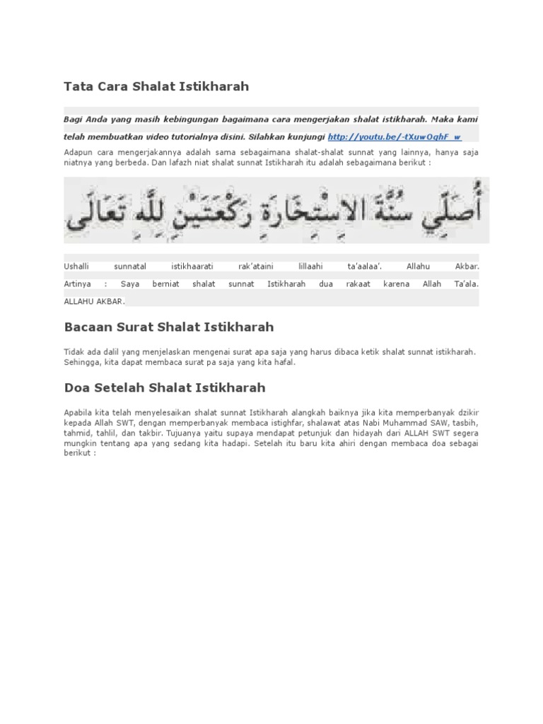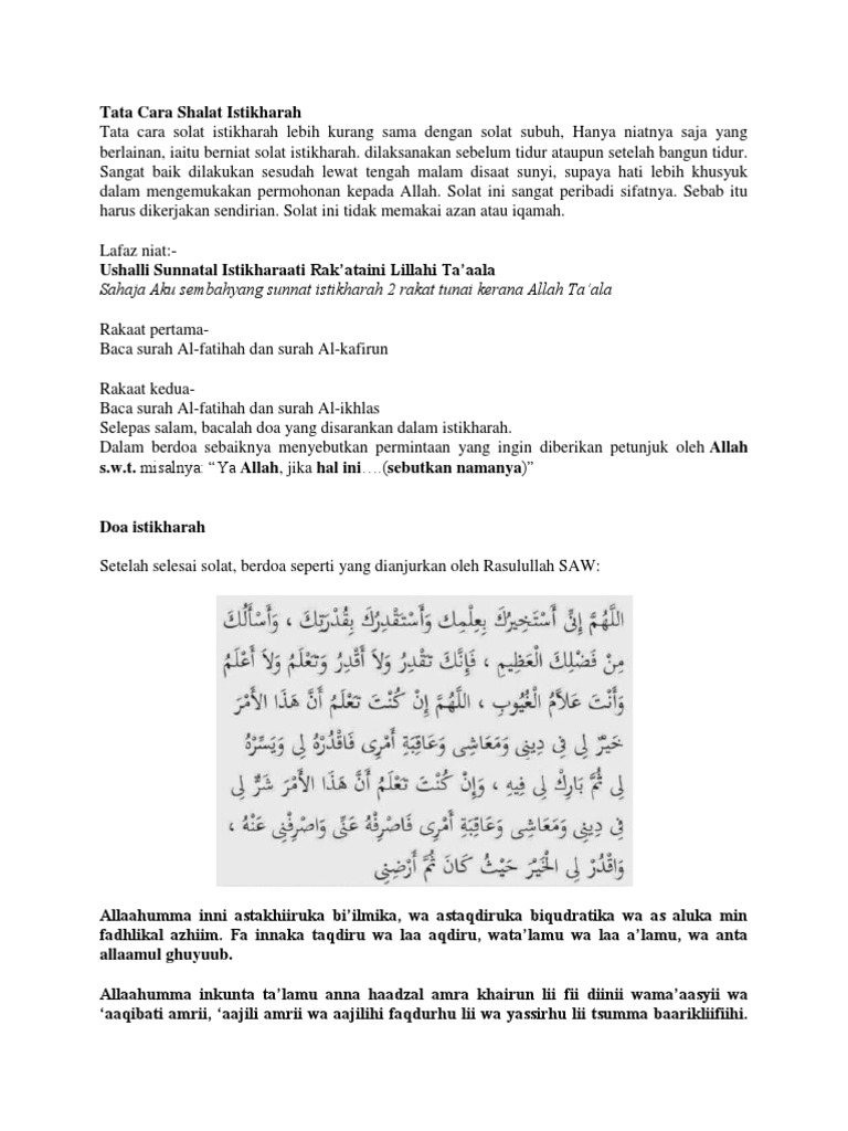 Shalat sunnah istikharah adalah shalat sunnah dua rakaat yang dilakukan oleh umat muslim yang sedang kebingungan untuk mengambil sebuah keputusan baik dari hal perjodohan ataupun ketika kita berada disimpang jalan dan kebingungan untuk mengambil jalan mana yang harus dilalui maka dari itu pinta lah petunjuk dari allah swt agar kita diberi petunjuk supaya tidak salah dalam mengambil sebuah. Doa sesudah shalat istikharah dan artinya shalat sunnah istikharah lengkap berdasarkan sunnah doa setelah shalat istikharah sholat istikharah memohon petunjuk atau memohon jodoh. Bacaan sholat sunnah istikharah lengkap dengan arab latin dan artinya.