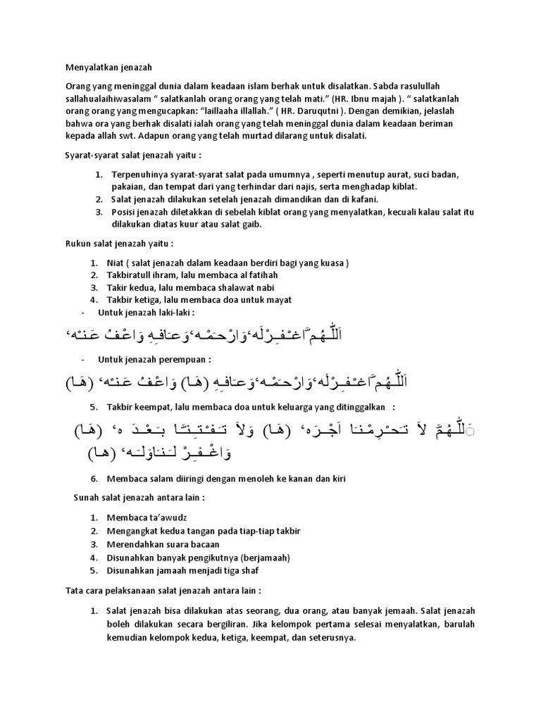 Hukum solat jenazah hukum solat jenazah adalah fardhu kifayah bermaksud ianya wajib ke atas umat islam asalkan ada yang melakukannya. Blog khusus doa mempelajari sholat jenazah mayyit haruslah benar benar jelipasalnya antara mayit laki laki dan perempuan untuk bacaannya berbeda misalnya dalam bacaan niat. Lalu masukkanlah ia ke dalam surga dan lindungilah ia dari cobaan kubur dan azab neraka.